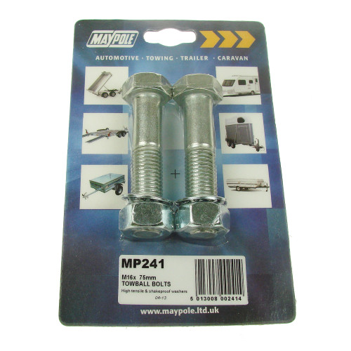 The Maypole MP241 set provides a pair of M16 nuts and bolts supplied with matching shakeproof washers, ideal for creating a secure and reliable fixing in a range of general engineering and trailer-related applications.